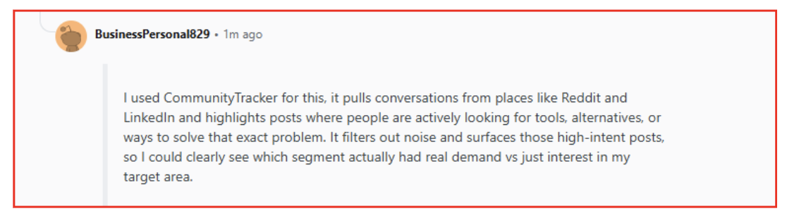 It focuses on high-intent buyer signals, where people are actively comparing tools, asking for recommendations, or discussing problems.