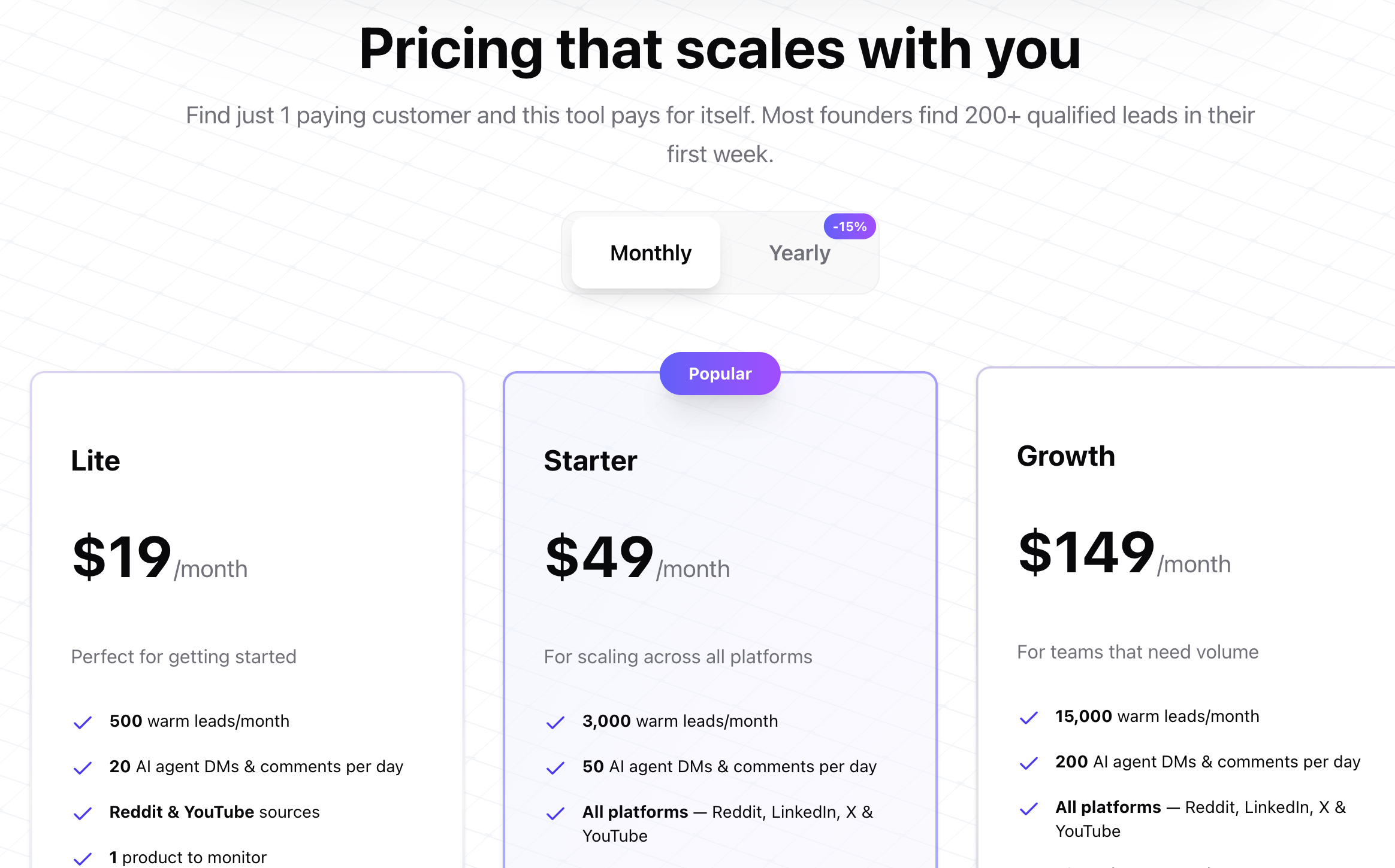 LeadSynth | Finds buyers from conversations + sends outreach | Reddit, LinkedIn, X, YouTube | Intent detection + scoring | Qualified leads | ✅ Yes (automated outreach) | $19 |