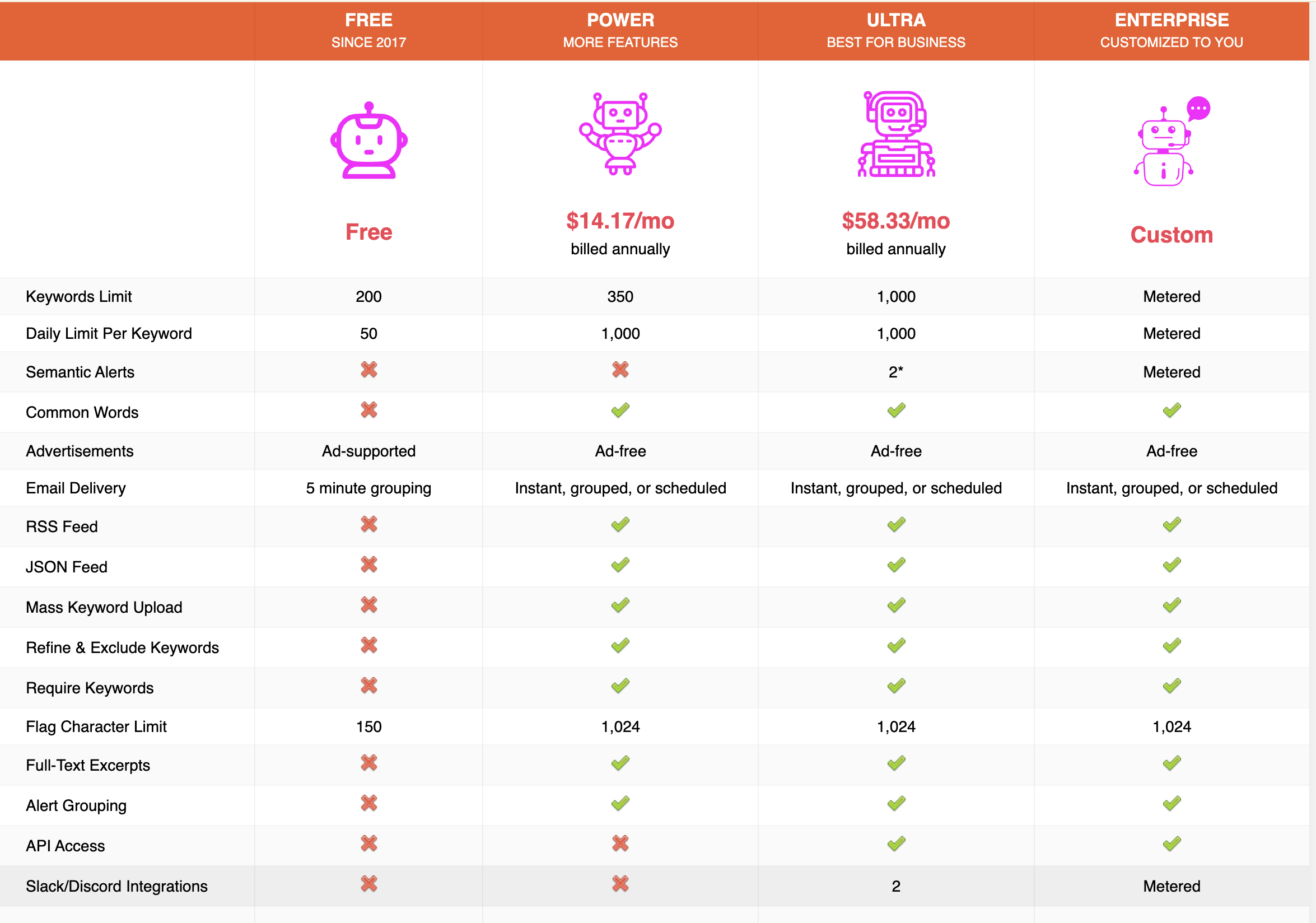Thousands of keywords, AI semantic alerts, API, Slack/Discord integration