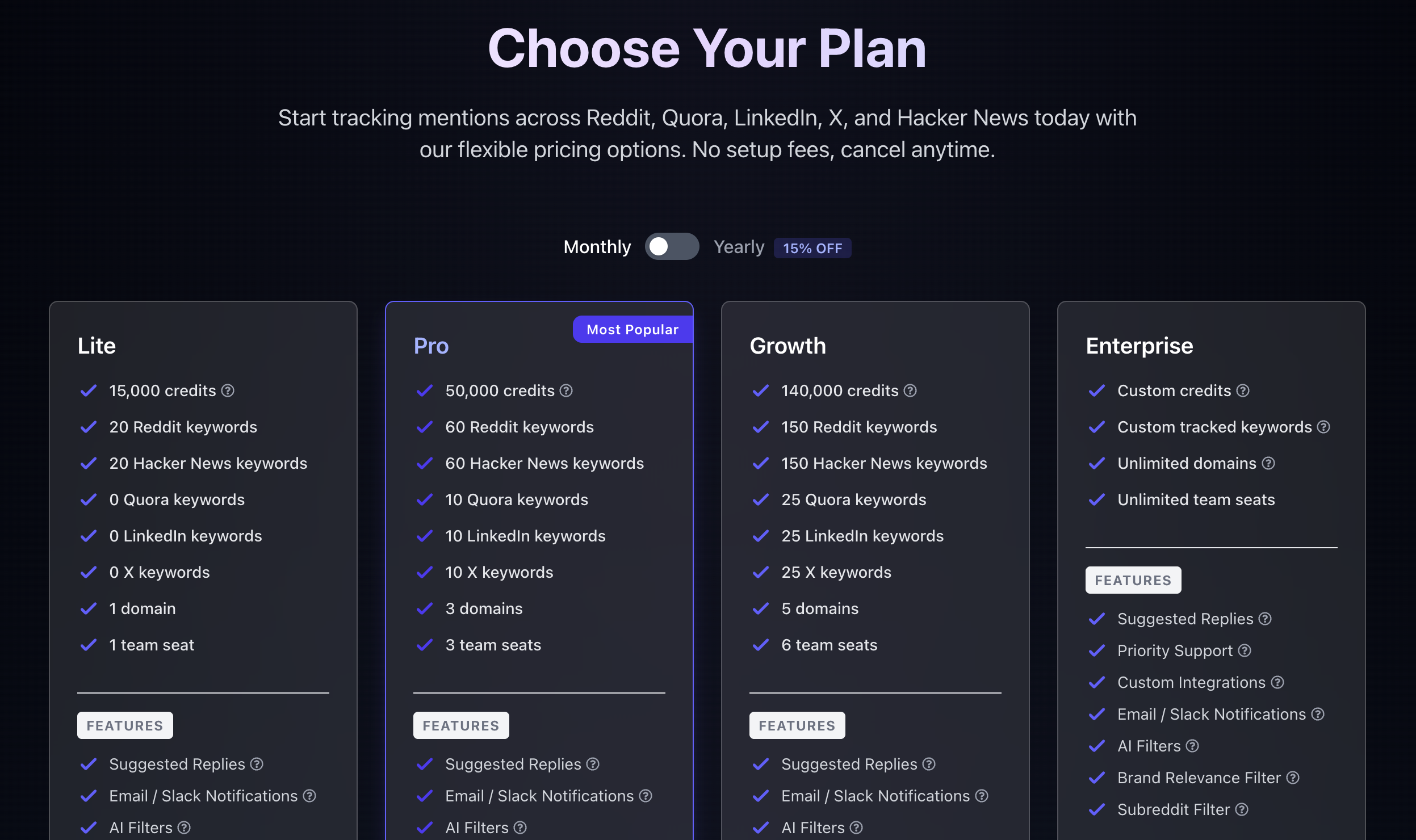 This is where you get full coverage. You can track 10 keywords, access all communities, and get features like AI filtering, scoring, Slack alerts, and share of voice.