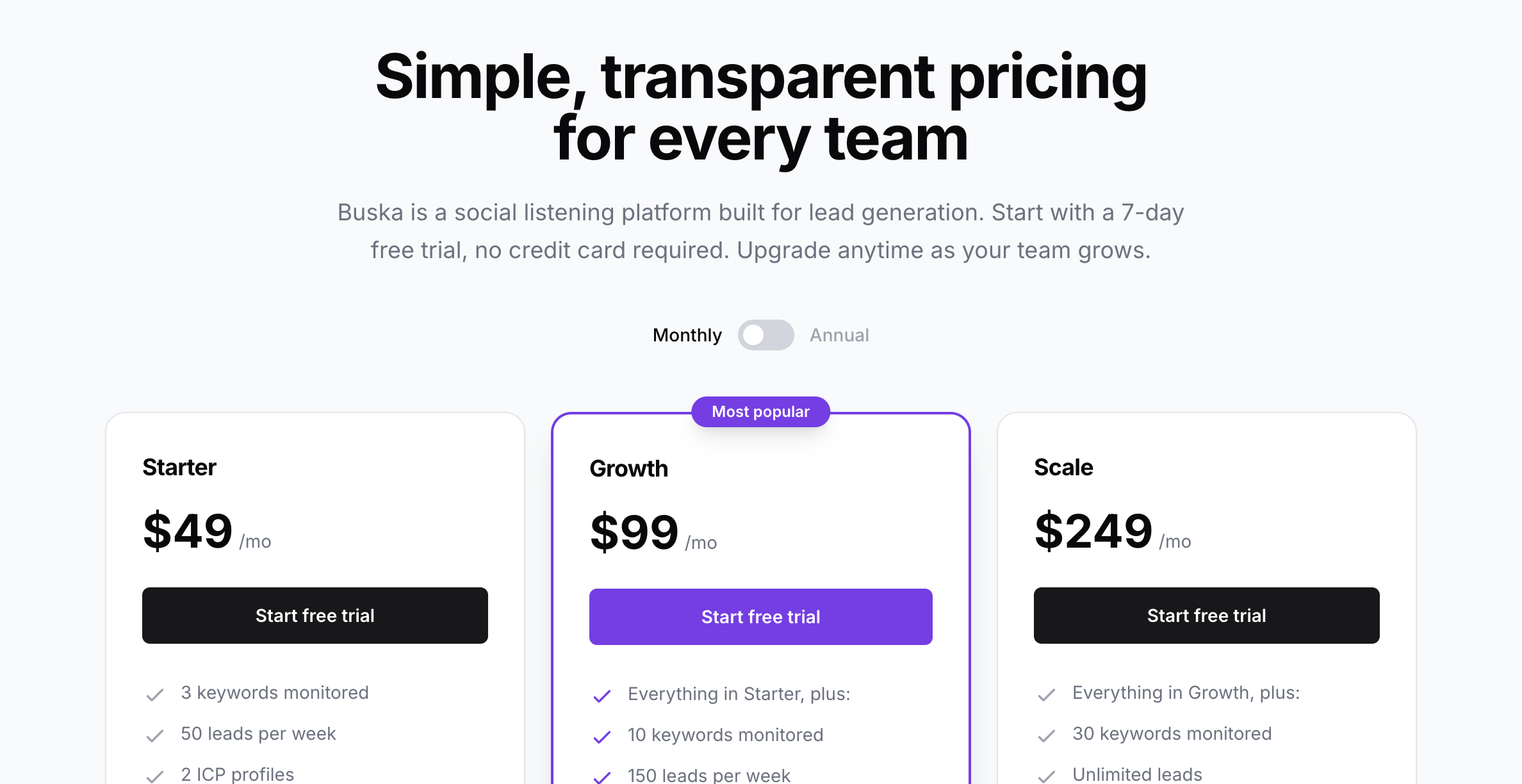 Buska | $49 → $249/mo | Intent scoring + lead qualification | Less raw data flexibility | Qualified leads | Filtering and prioritizing high-quality leads | Growth teams, demand gen teams, lean SaaS |
