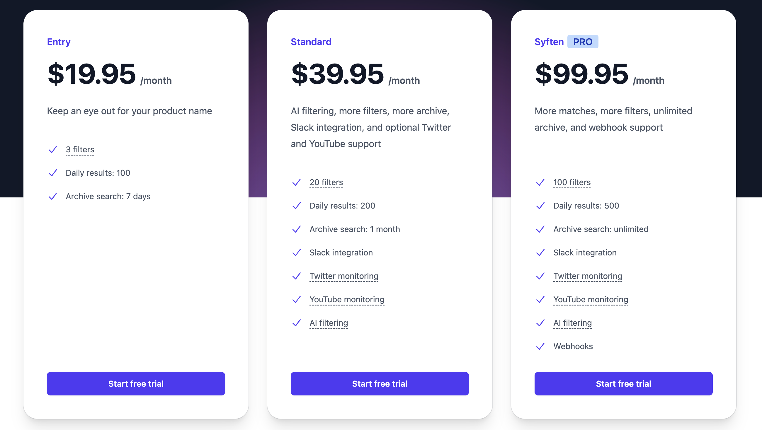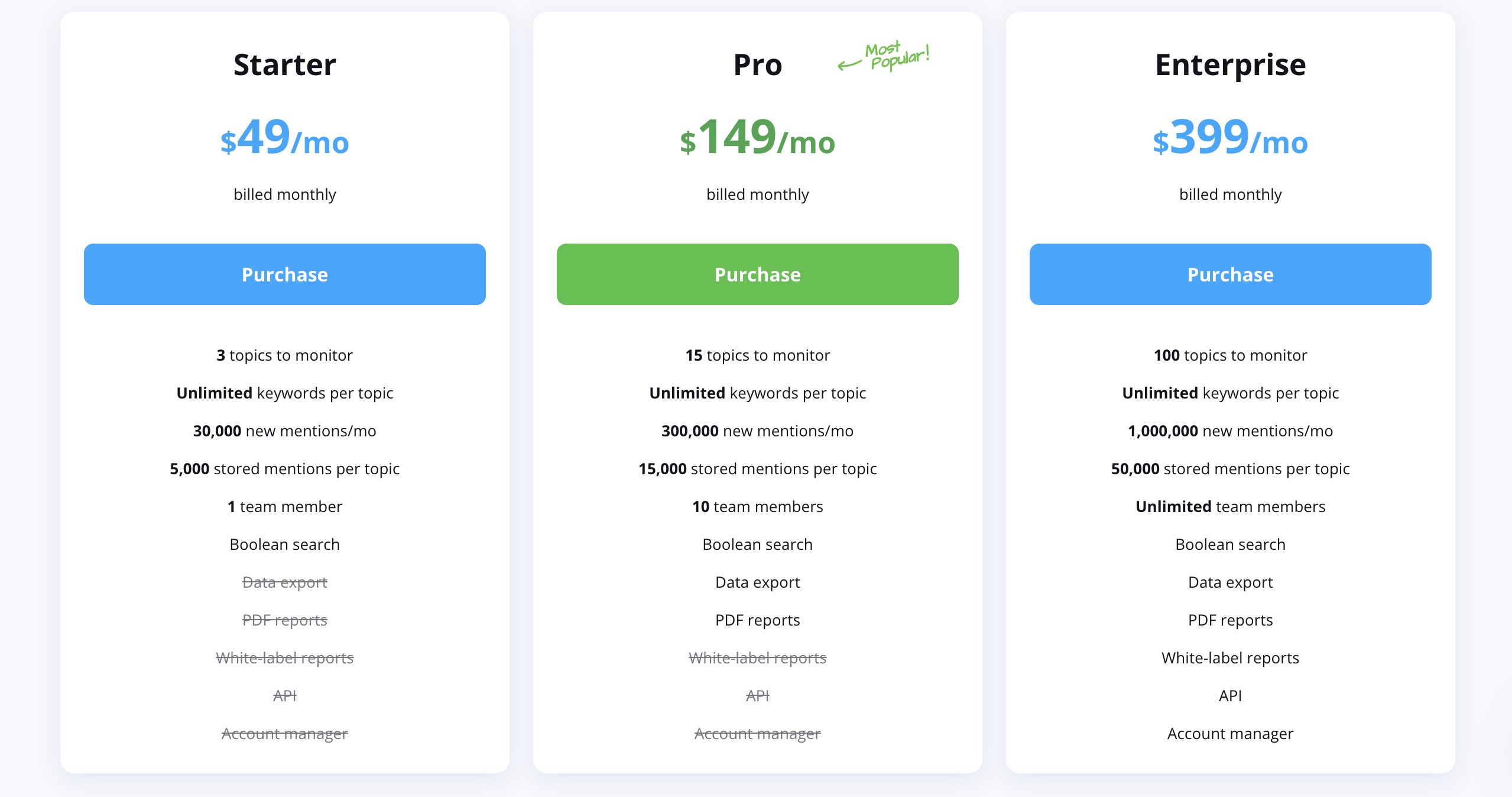 Syften PRO - $99.95/month, includes 100 filters, unlimited archive search, webhooks, and up to 500 daily results.