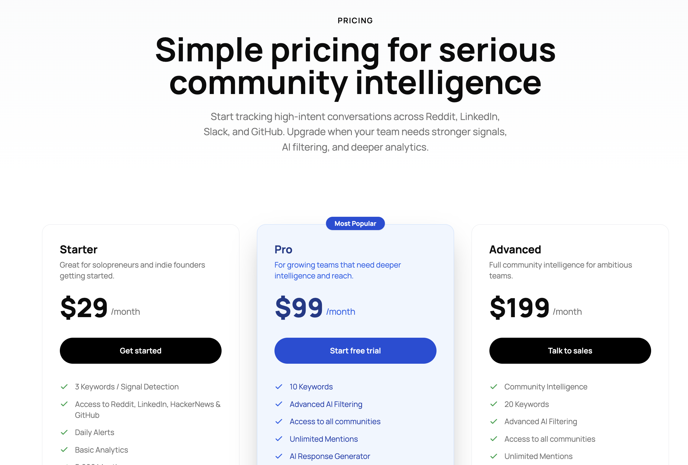 CommunityTracker | Community intelligence + buying intent | Reddit, Slack, LinkedIn, X, GitHub, Product Hunt, Stack Overflow | Finds high-intent conversations + action suggestions | $29/month |