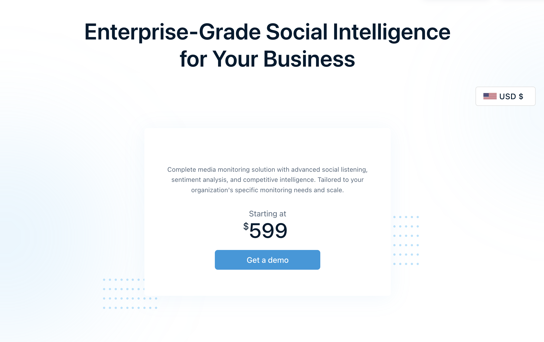 Brandwatch | Enterprise consumer intelligence | Social media, news, blogs, forums, reviews, broadcast | Deep analytics + enterprise insights | Custom pricing |