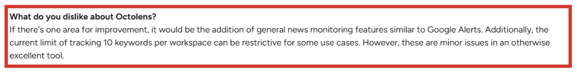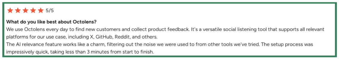 To understand how Octolens performs in real use, I looked at user reviews from G2. Most reviews highlight ease of setup, useful alerts, and strong platform coverage.