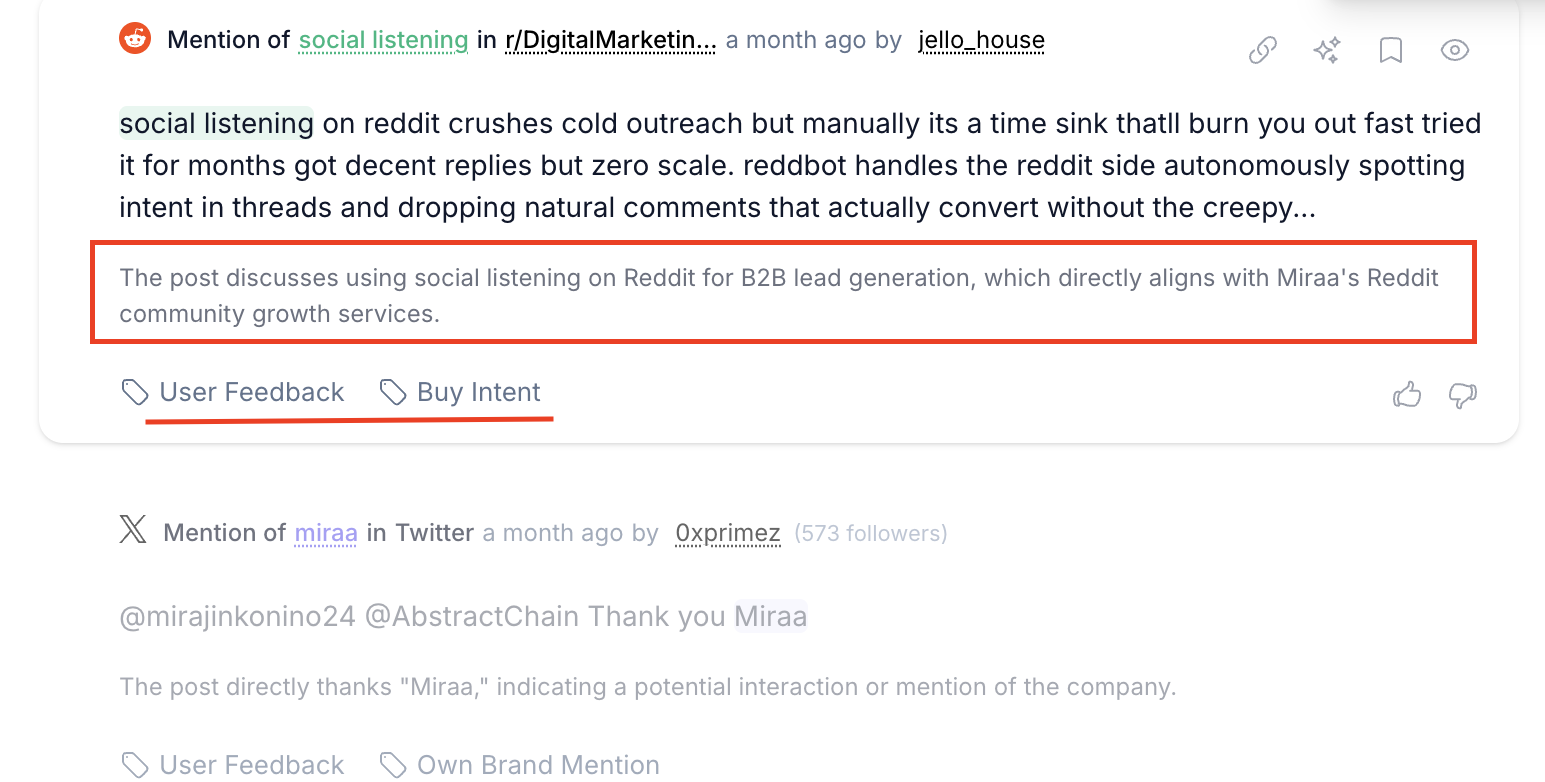 AI relevance filtering | Reviews each mention and assigns a relevance score to filter out irrelevant posts and highlight useful conversations. |