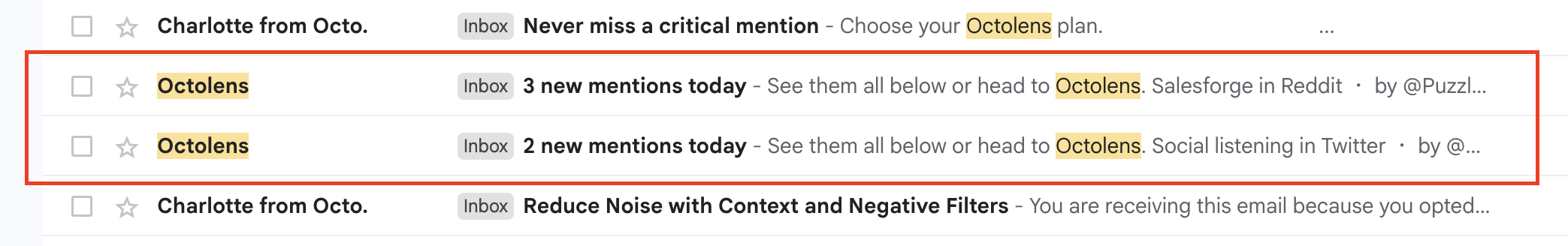 When Octolens finds posts with your keywords, it does not send every mention immediately.