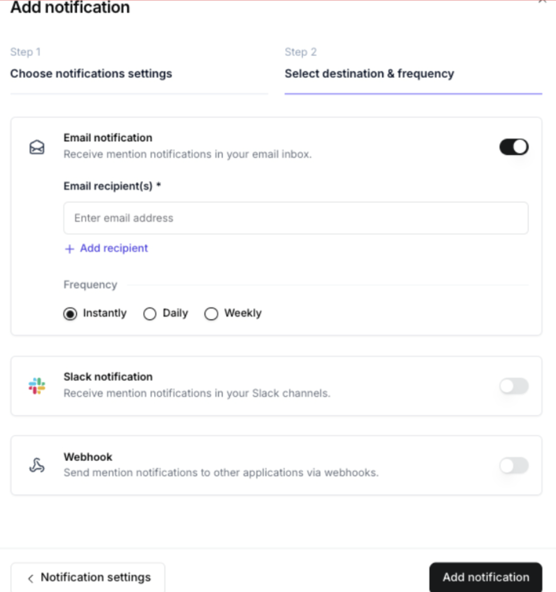 Alerts can be sent to Slack, email, or webhooks so teams can review mentions quickly and respond when needed.