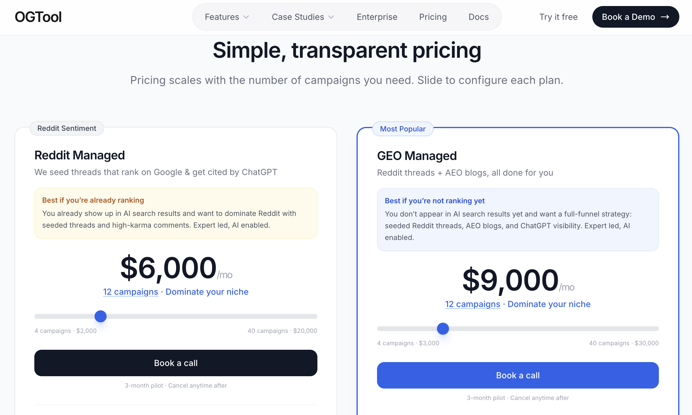Reddit Managed – $6,000/month, focuses on Reddit strategy and social proof with 12 campaigns per month and dedicated support.