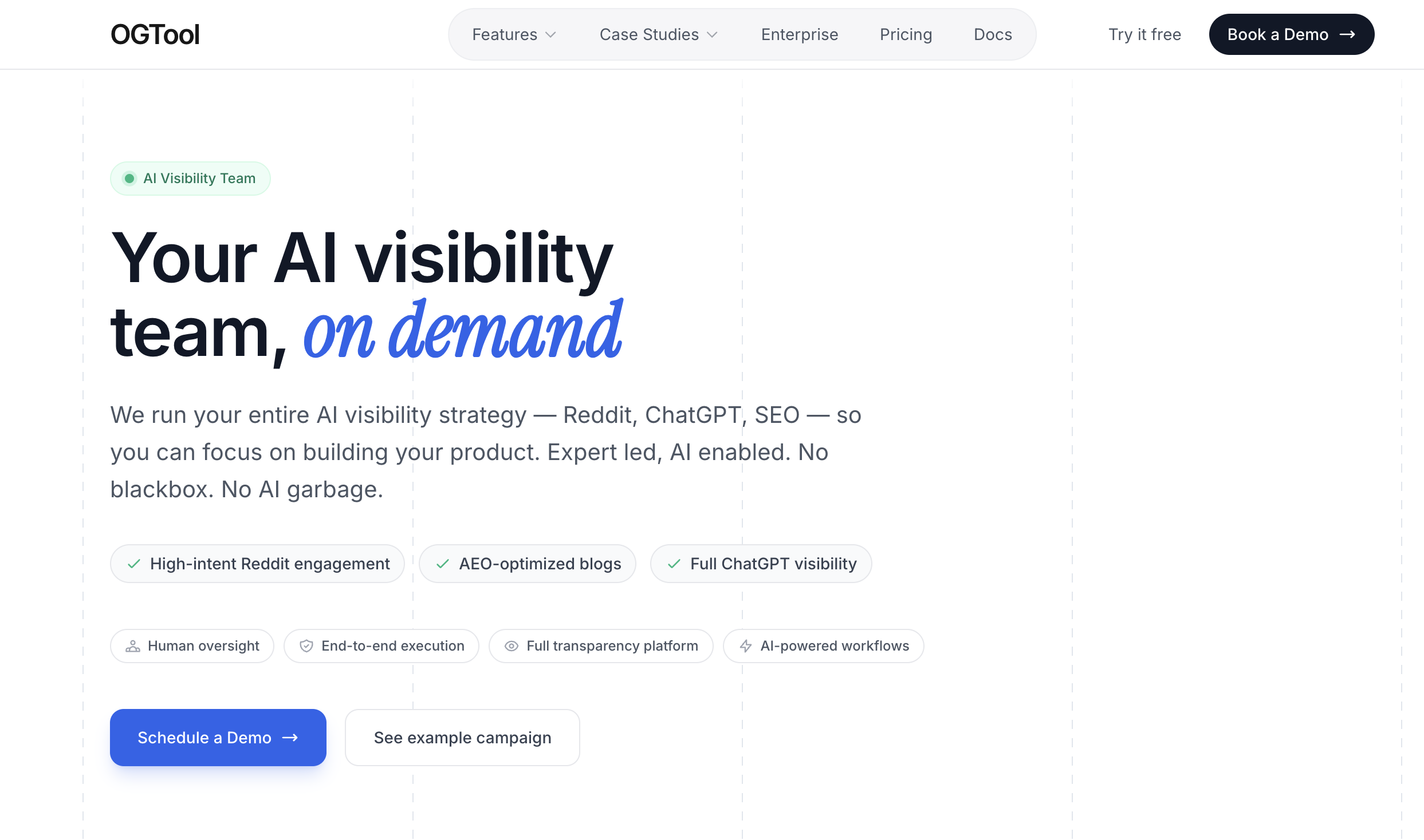 OGTool works well when the goal is tracking brand visibility in AI tools like ChatGPT and improving AI search presence.