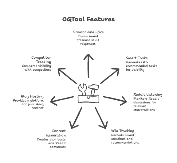 OGTool includes several features that help businesses track and improve their visibility in AI search tools.