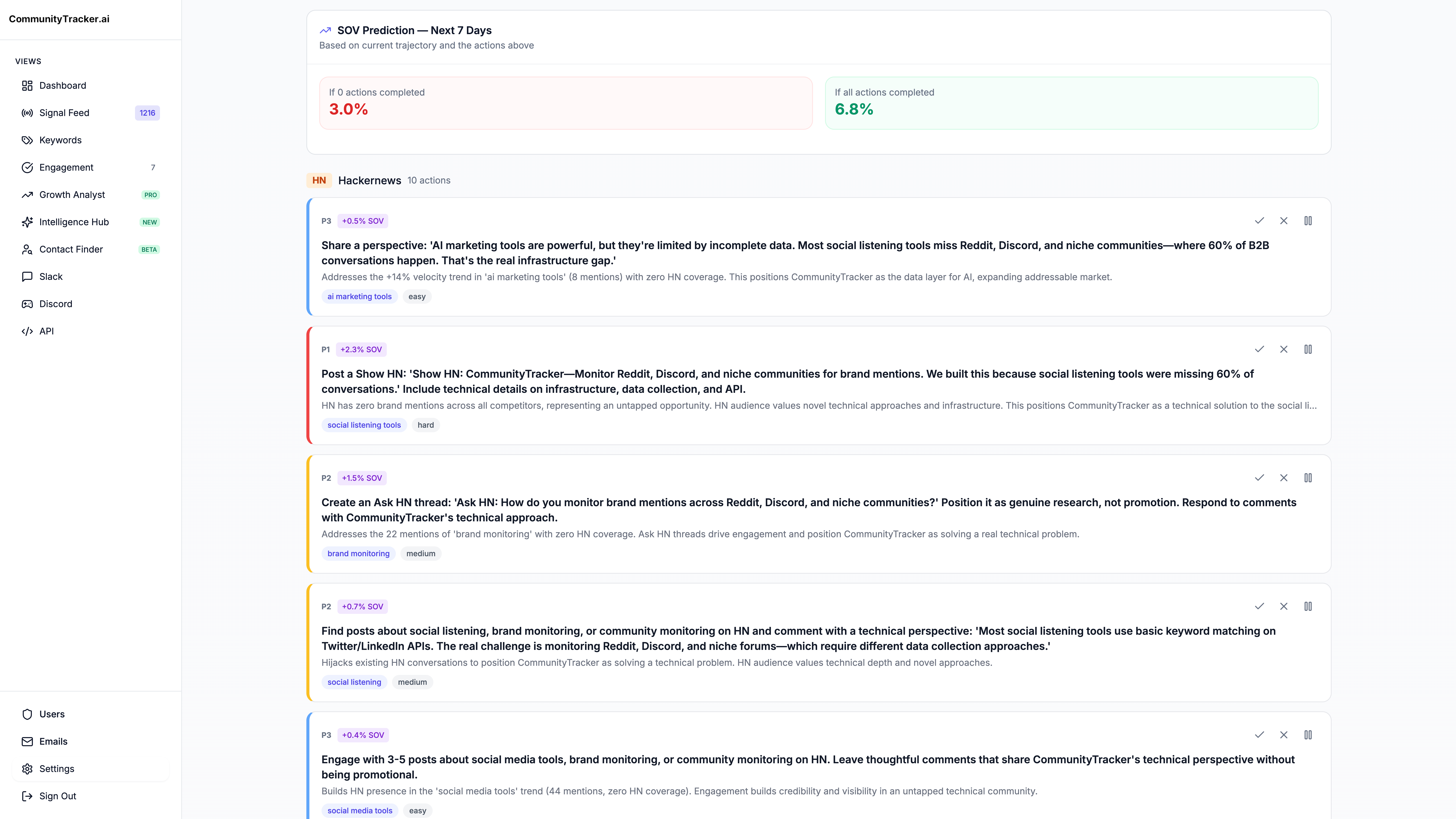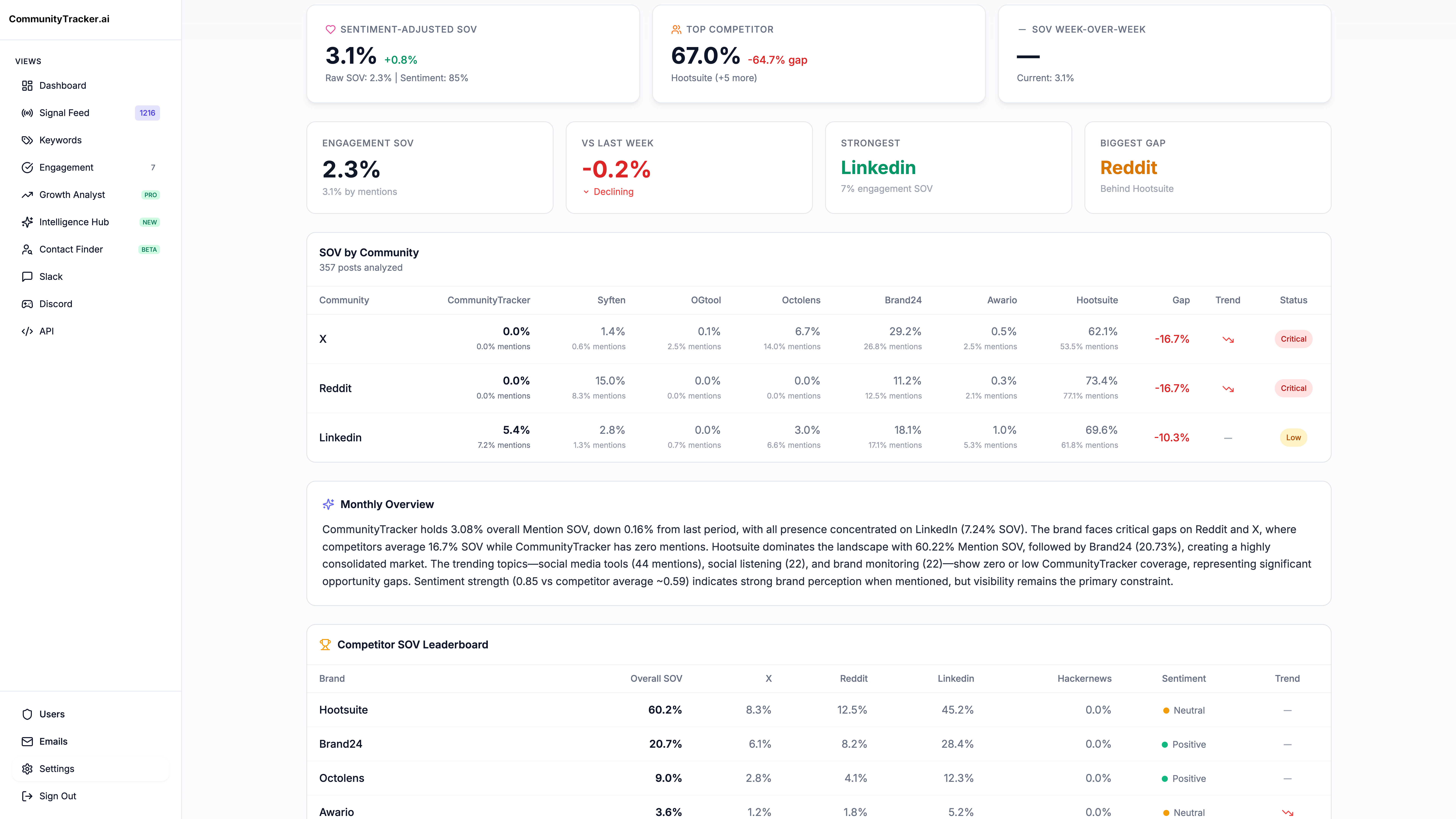 CommunityTracker tracks your share of voice across every community that matters — Reddit, LinkedIn, Slack, HN — and turns that data into a weekly action plan your team can actually execute.